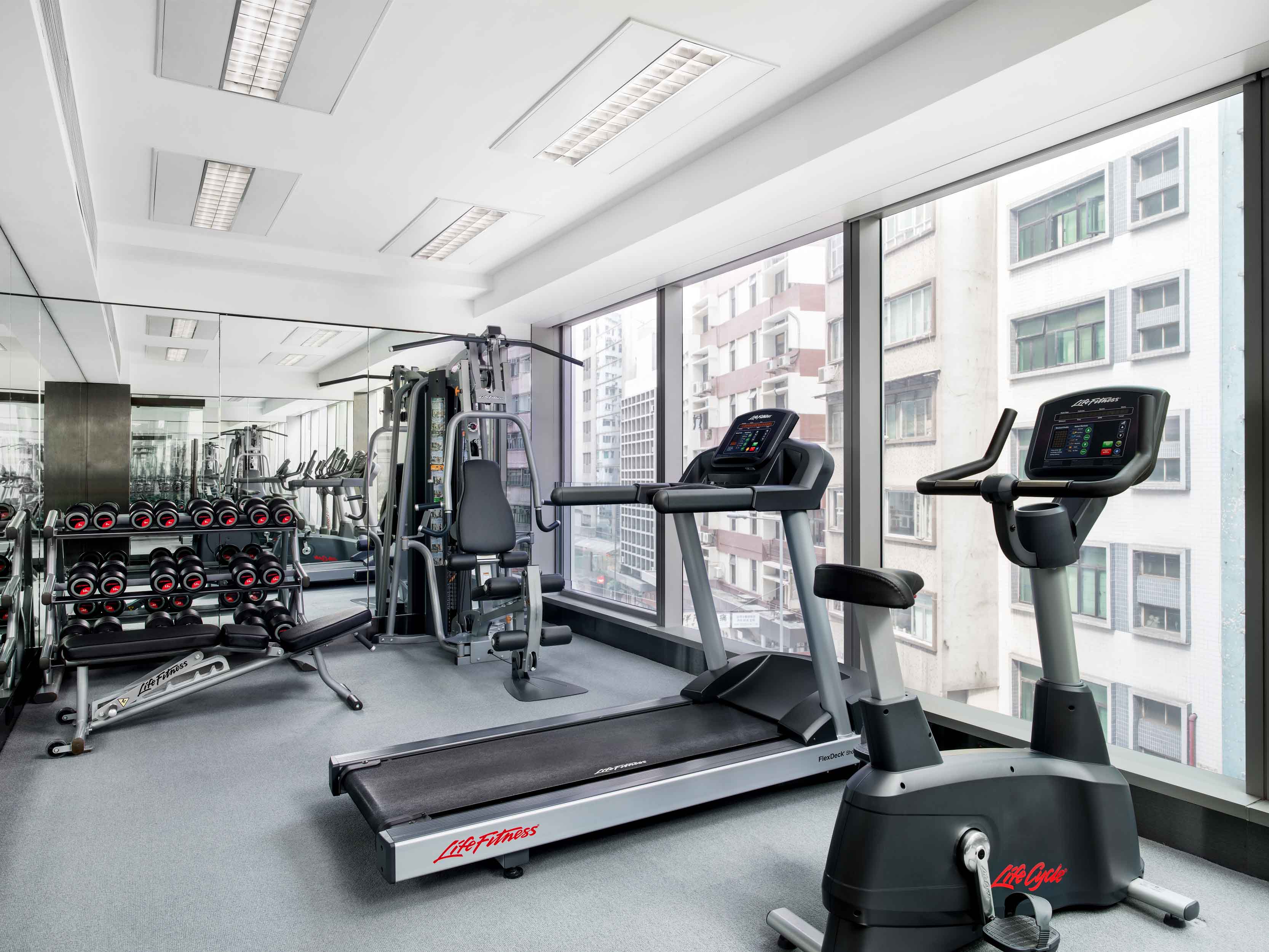 Gym equipped with Life Fitness machines and free weights.